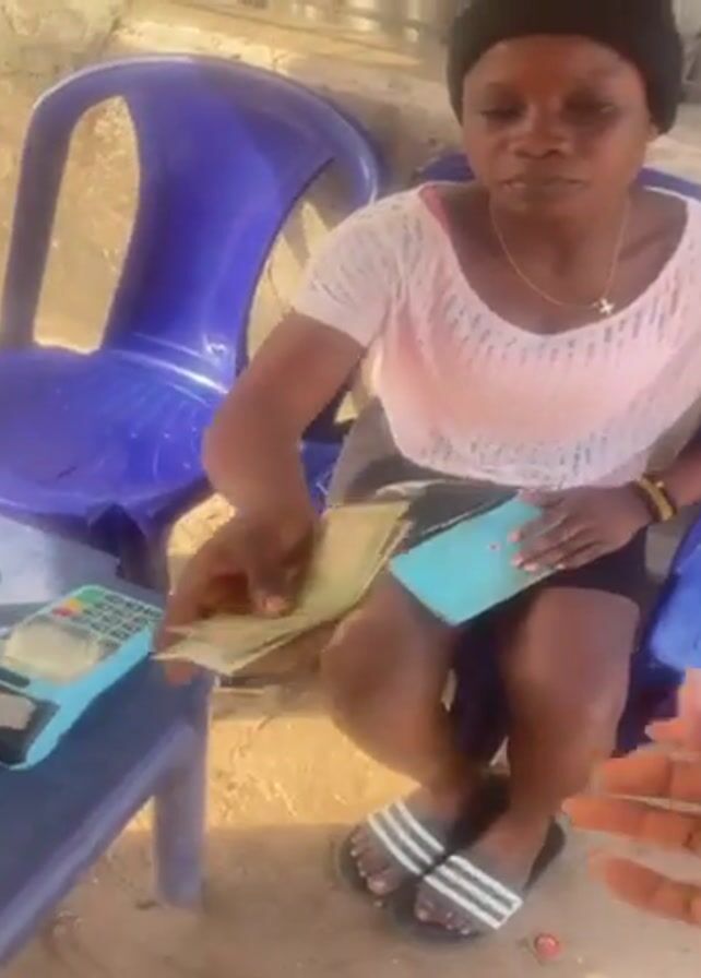 A woman is sitting in a blue plastic chair at a blue plastic table, counting cash and placing it on the table. A person hands the woman money. On the table is a light blue debit card reader and a light blue wallet. Behind the table, out of focus, are several blue plastic chairs. In front of the table is a light brown dirt floor. On the table are two translucent plastic buckets filled with a light orange substance and covered with translucent plastic lids. A piece of cardboard is taped to the top of one of the buckets.