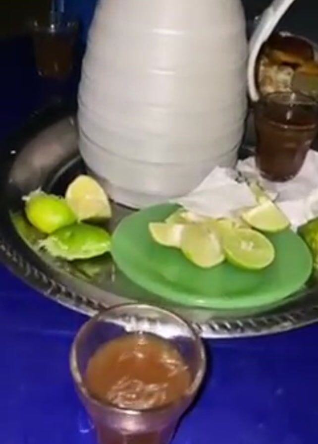 table set with a silver tray holding a white pitcher, a green plate with lime wedges, a glass of amber liquid, and another plate with what appears to be flatbread and fried food. A small glass of the amber liquid sits on the blue table in the foreground. Another glass of the liquid sits on the silver tray along with napkins. Someone's arm is visible in the upper right corner of the frame. The environment appears to be dimly lit.