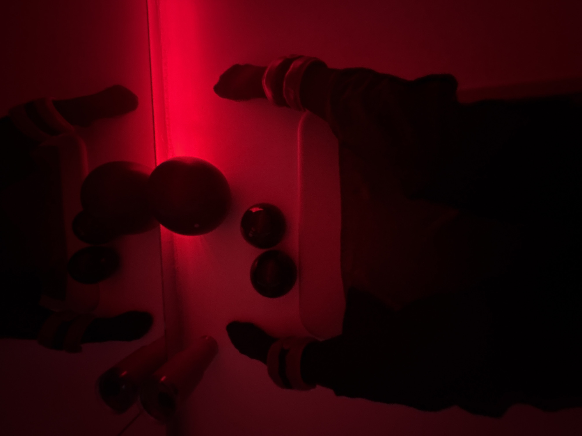 person's hands in a red-lit room. One hand is near a door or panel with a white frame, and there appear to be several dark round objects on or near the panel. The other hand is partially visible on the left side of the image. The person's clothing is dark, with light-colored wristbands visible on both arms. There is a reflection of the scene on the left. The location is not discernible based on the image.