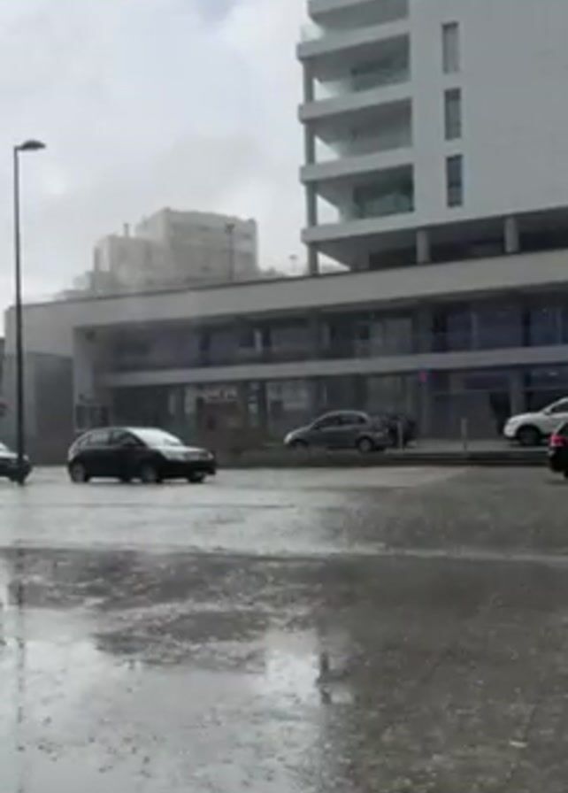 rainy scene in what appears to be a city. Cars are parked on the side of the street and one car is driving through an intersection. A large white building with multiple floors and balconies is visible. The road is wet, reflecting the light from the overcast sky. Rain is falling heavily. There are also streetlights present.