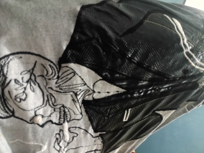 A close-up, upward-angled image taken in Parand, Iran, displays a segment of a textile, possibly an item of clothing or a blanket. The upper section of the textile is a dark, possibly black, textured fabric, appearing to have a mesh or waffle weave, accented by white piping or stitching along edges. Below this, the textile transitions to a lighter, light grey material. Prominently featured on the lighter fabric are black line-art illustrations. The primary illustration depicts a stylized human face in profile, with an open mouth showing teeth, from which a white, fibrous element extends, resembling smoke or breath. Below this face, another stylized illustration features a branch with leaves. To the right of the central face, a partial, abstract hand-like shape with thin lines is visible. The background is out of focus, showing a blurred blue-grey surface on the right and a lighter, indistinct surface on the left, consistent with an indoor environment.