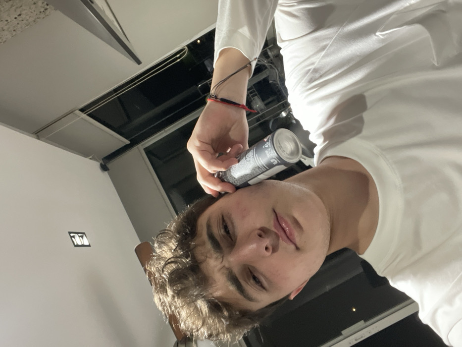 A selfie shows a young man with curly brown hair holding a black and silver can up to his left ear. He is wearing a white, long-sleeved shirt. His left hand is visible, adorned with a red and black bracelet. The background includes a white wall with an electrical outlet and a ceiling featuring some kind of mechanical or electrical component. The image is somewhat rotated.