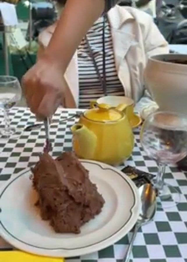 server serving chocolate mousse onto a plate at an outdoor restaurant. A woman in a white jacket and striped shirt is seated at the table. The table has a green and white checkered tablecloth. On the table, there is a plate with the restaurant's logo, silverware, glassware, and a yellow teapot. The server uses a spoon and a fork to transfer the chocolate mousse from a large container onto the plate. The camera zooms in on the plate of chocolate mousse.