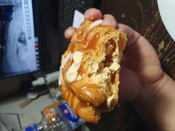 A hand holds a partially eaten éclair. The pastry is glazed with caramel and topped with sliced almonds. The éclair is filled with a tan-colored cream. In the blurry background, a computer monitor displays a bright screen. A water bottle and other items are visible on the desk. A patterned object is visible on the right.
