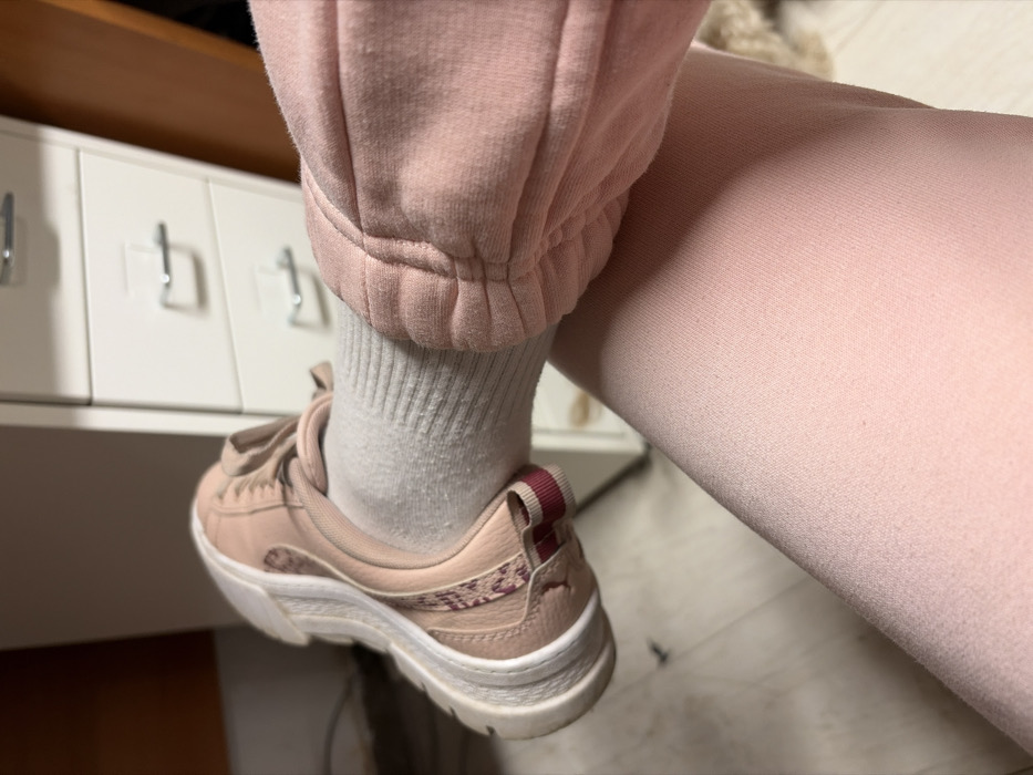 An individual's left lower leg and foot are depicted in a close-up, angled view within an interior space. The leg is clad in light pink sweatpants featuring an elasticized, gathered cuff at the ankle. A white ribbed sock is worn beneath the sweatpants cuff, extending into a light pink athletic shoe. The shoe exhibits a thick white sole, pink laces, and a maroon and white striped pull tab at the heel, with textured or patterned textile sections on its upper. The foot is positioned with the sole visible towards the lower left. In the background, a white metal filing cabinet with three visible drawers, each equipped with a horizontal silver pull handle, is present. The floor is a light-toned surface, possibly wood or laminate. No specific geographical location within Plovdiv, Bulgaria, can be identified from the visual evidence presented.