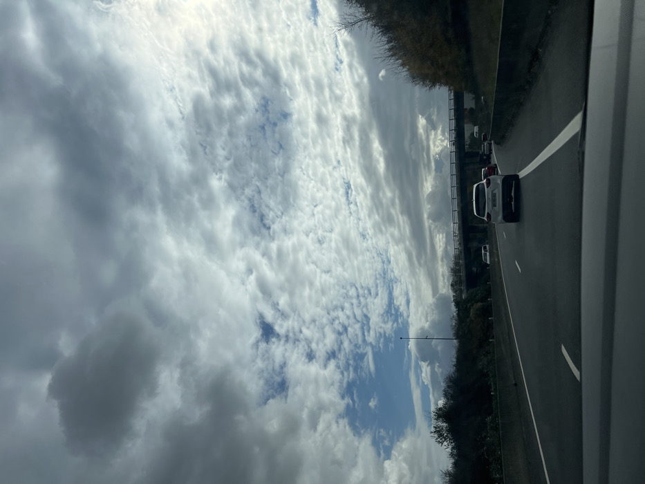 The image displays a multi-lane highway scene on the A13 Autoroute, eastbound, in Mondeville, France, specifically approaching the overpass carrying Rue du General Koenig (D40). The perspective is from inside a vehicle, with the dashboard partially visible at the bottom. The asphalt highway features at least three visible lanes, marked by broken white lines, and a solid white line delineating the right shoulder. A white SUV, possibly a Renault Kadjar, is positioned directly ahead in the middle lane, showing its rear and taillights. Further ahead, a red sedan and a white van are visible among other vehicles in moderate traffic flow. Vegetated embankments line both sides of the highway. On the left, a dark green, densely bushed embankment rises, from which a tall, slender black pole, topped with a small surveillance or sensor device, extends upwards. The right embankment is also steep and covered with trees, some displaying reddish-brown foliage indicative of autumn. A concrete overpass, identified as carrying Rue du General Koenig (D40), spans the highway in the mid-distance. The bridge possesses a concrete deck and metal railings, with vehicles visible moving across its surface. The sky is largely overcast with a mixture of grey and white altocumulus and stratocumulus clouds. Sections of blue sky are visible, primarily in the upper left. The lighting is diffused, consistent with a partly cloudy daytime. No individuals are discernible outside of the vehicles.