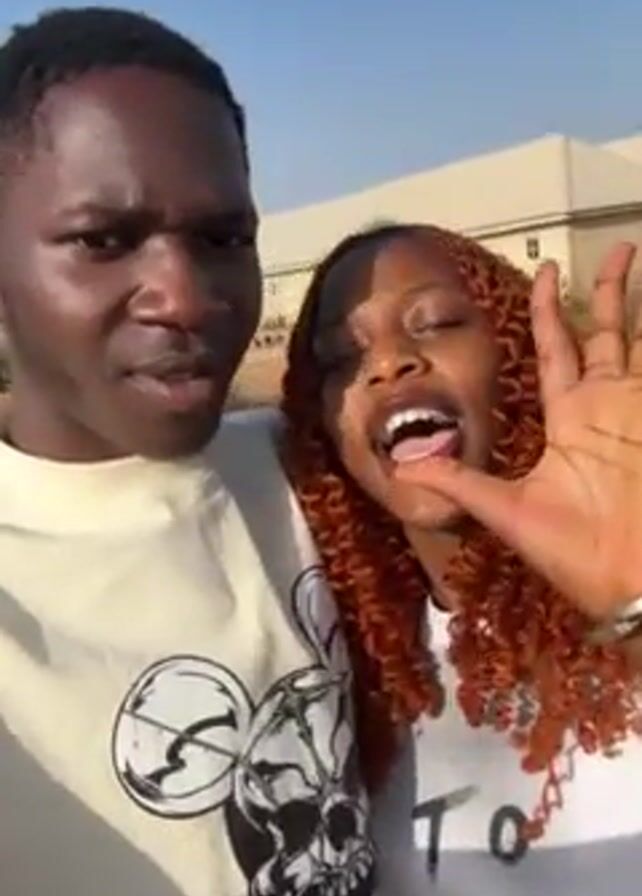 A young man and woman are standing outside in front of a tan building on a sunny day. The man is wearing a light-colored Mickey Mouse sweatshirt. The woman has curly red hair and is wearing a white sweatshirt with black writing. The man has his arm around the woman, and they are facing the camera talking to the viewer. The woman says, “Hello guys, how are you doing? I’m here with my man.”