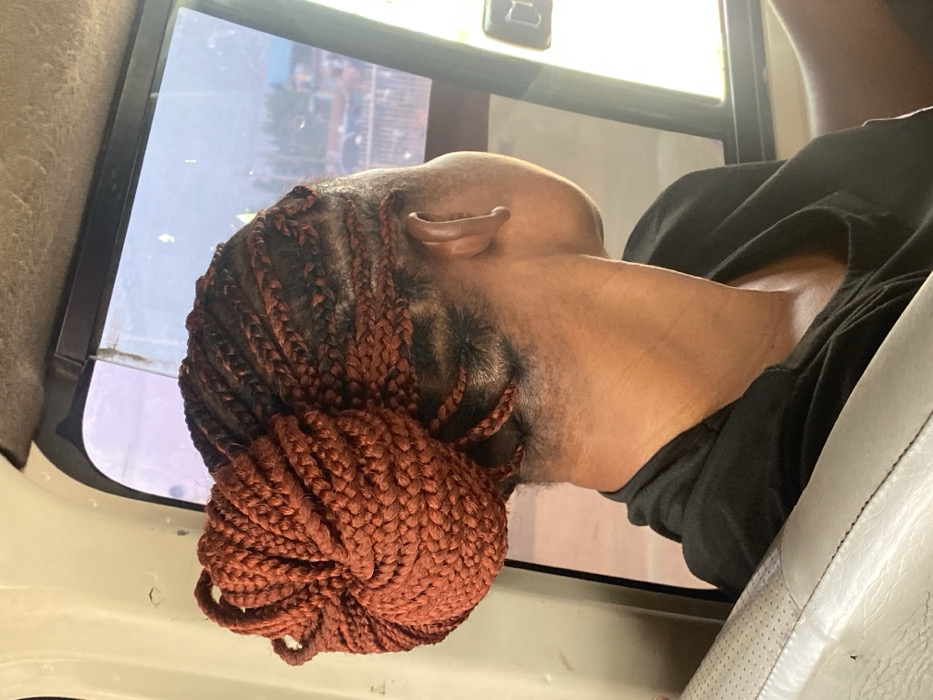 The image captures a partial view of an individual from behind and to the right, situated inside a vehicle in the city of Shagamu, Nigeria. The subject, an adult with brown skin, is oriented towards the right, looking out of a vehicle window. Their hair is styled in numerous reddish-brown box braids, gathered into a large, intricately coiled bun positioned at the crown of the head. Shorter braids and visible scalp, resembling cornrows, are present at the nape of the neck. The individual wears a black garment, visible over the shoulder and upper back. The interior of the vehicle shows a light-colored, possibly grey or off-white, upholstered seat back in the foreground, indicating a passenger's position. Above the window, the vehicle's interior roof lining is visible, appearing light-colored and textured. A dark window frame delineates the side window. Through the window, a blurred urban environment is discernible. Multiple structures, characterized by light-colored roofs and walls, suggest buildings in the background. The general impression is an outdoor city scene under diffused light.