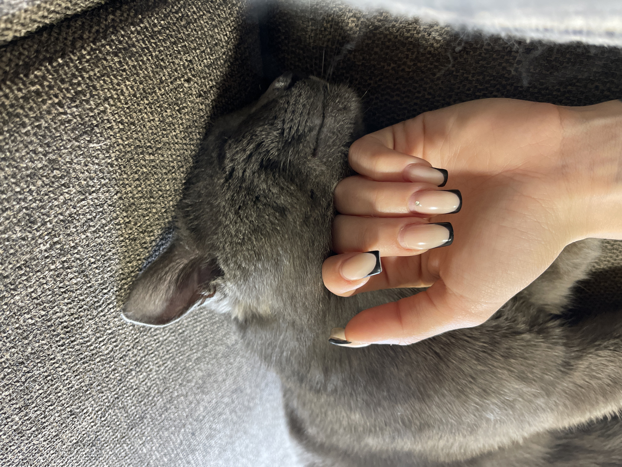 A gray cat rests on a gray upholstered surface. A fair-skinned hand with manicured nails featuring black tips is placed on the cat’s head. The location is not discernible as Totleben, Bulgaria from the provided image.