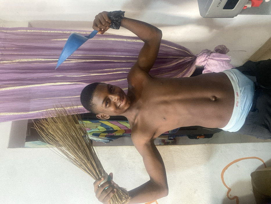A shirtless young man smiles, holding a broom in his right hand and a blue dustpan in his left
