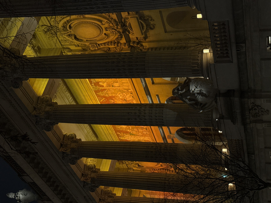 The image showcases the architectural details of a building, likely a library or government building, at night. Ornate columns stand prominently, with the camera angle tilted upwards to reveal elaborately decorated ceilings and friezes between the columns. A sculptural element, possibly a gargoyle, is visible to the right. Bare tree branches frame the scene. The illumination provides a warm, golden glow, enhancing the classical designs of the structure.