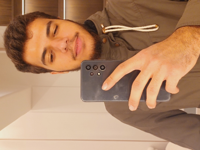 A person takes a selfie with a smartphone, holding it in their right hand. The individual has dark hair, a beard, and light skin. They wear a green jacket with a drawstring closure near the collar. The background features light-colored walls and wooden cabinets. The phone, a dark grey color, obscures part of the person's face.
