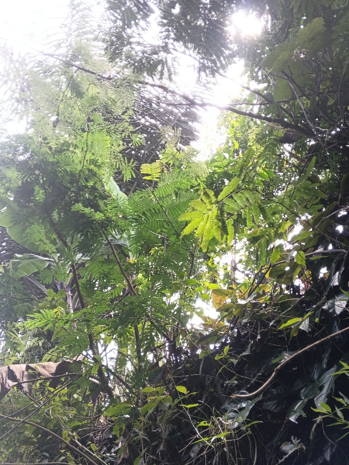 Sunlight filters through a dense canopy of green foliage. Fern-like leaves mix with broader leaves, creating a layered effect. A banana leaf is also visible. The image is taken from a low angle, looking upward into the tree cover. The light is bright, obscuring details in the upper branches and creating a hazy effect. The overall impression is one of lushness and dense vegetation.