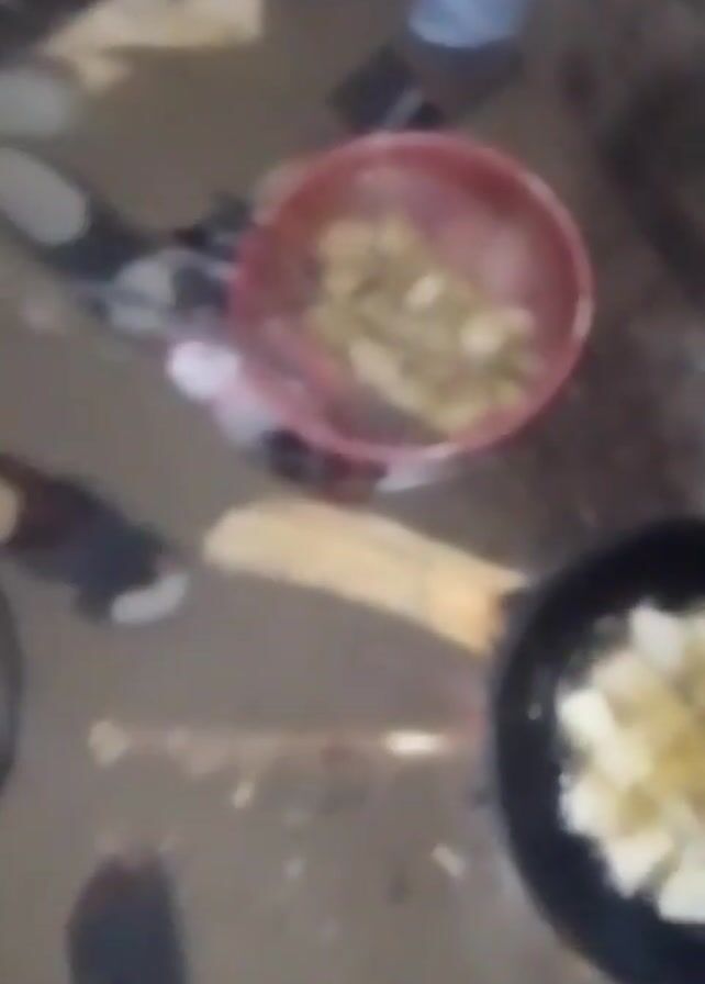 The video, shot from above with a handheld camera, shows a ground-level scene with several people standing around. A red plastic basket contains pieces of food, likely potatoes, some appearing browned. Nearby, on a black surface, are more potato pieces, possibly seasoned. Pieces of wood and scraps of paper are scattered on the ground. The scene seems to depict food preparation, possibly cooking potatoes. The video is somewhat blurry and shaky.