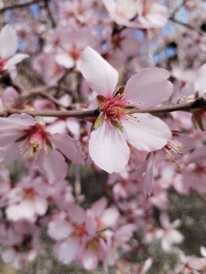 A close-up photograph depicts multiple light pink blossoms on a tree branch in Limbur, Uzbekistan. The central subject is a fully open blossom with five pale pink petals, a prominent pink center, and numerous yellow-tipped stamens. Green sepals are visible at the flower's base. To the left, a second blossom is partially visible and less distinct. The background comprises numerous out-of-focus pink blossoms and interwoven brown branches. Sections of a light blue sky are discernible through the upper foliage. The scene is illuminated by ambient light. No human figures or artificial structures are present.