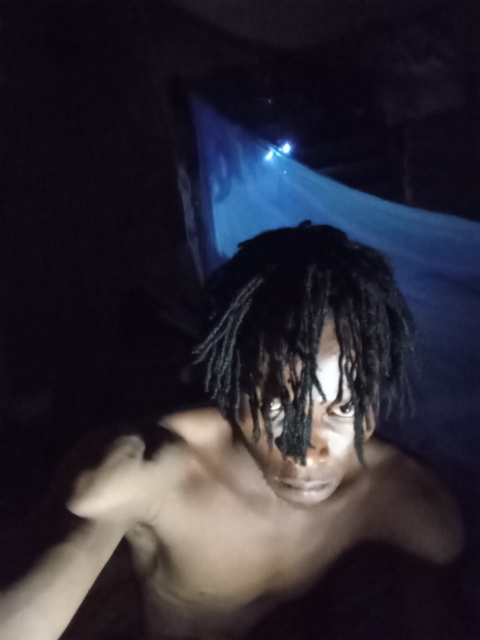 The image depicts a bare-chested individual with dark skin and prominent black dreadlocks looking directly into the camera. The setting is extremely dark, illuminated by what appears to be a frontal light source, casting some light on the subject's face and upper torso. To the upper right of the frame, a blue fabric, possibly a mosquito net, is visible, behind which two small, bright pinprick light sources are discernible. The environment appears to be an interior space or a sheltered area during nighttime, consistent with low-light conditions. The scene is located in Omicha Umu Awada, Nigeria.