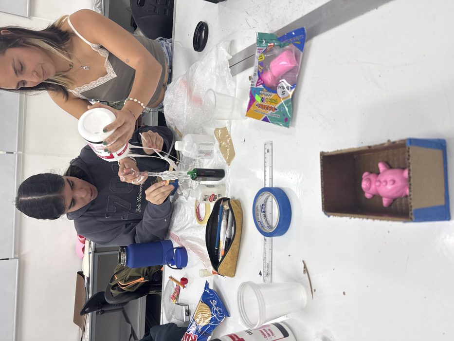 Two women are working on an art project at a table. One woman is pouring white glue from a container, while the other is holding and manipulating string or yarn, which is becoming covered in glue. Various supplies surround them: containers, tape, rulers, craft materials, a pencil case, water bottle, snacks, and a pink clay pig. The pig is in a small cardboard box taped with blue tape.