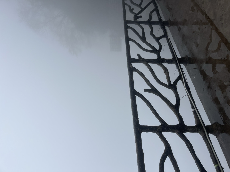 An abstract design mimics tree branches in a dark gray pattern against a foggy sky. A wall with a rough texture is visible next to the design, with an electrical wire running along it. The fog obscures the background, creating a muted and ethereal effect. The overall composition is asymmetrical, with the design occupying the right side of the image and the fog dominating the left.