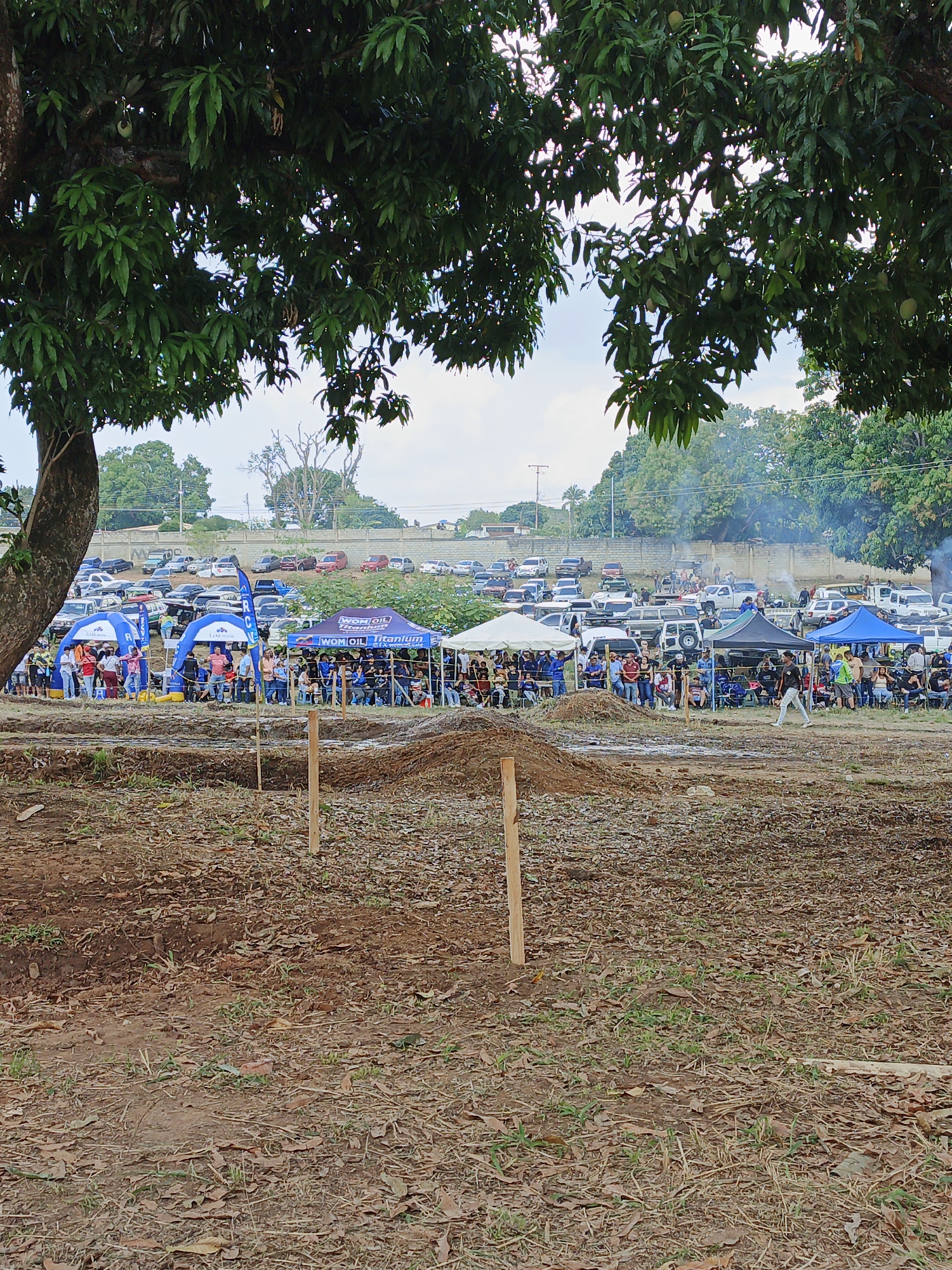 The image depicts an outdoor event likely in Tinaquillo, Venezuela. The foreground is characterized by a dirt field covered with dry leaves and sparse vegetation. In the middle ground, there's a small obstacle marked by wooden poles and straw. Behind this, a crowd of people is gathered, watching something, likely a competition or performance. Several tents and canopies are set up, suggesting organized activities. In the background, a large parking area is filled with cars, and a concrete wall or embankment separates the event area from the parking. Trees surround the periphery of the scene, providing a natural backdrop. Smoke rises in the distance, indicating possible food preparation or other activities. The sky is overcast.