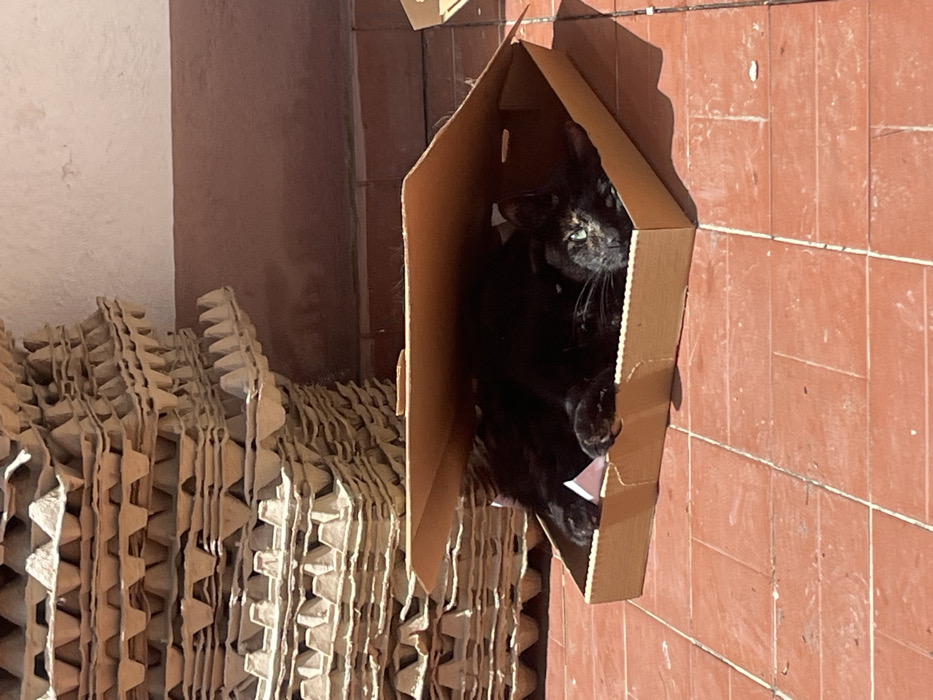A black cat sits inside a cardboard house-shaped box. The cat faces forward with piercing green eyes and a tortoiseshell pattern on its face. Stacks of cardboard egg cartons are visible behind the box. The scene is bathed in bright sunlight, casting shadows on the box and the red tile wall to the right. The lighting and shadows create strong contrasts in the image.