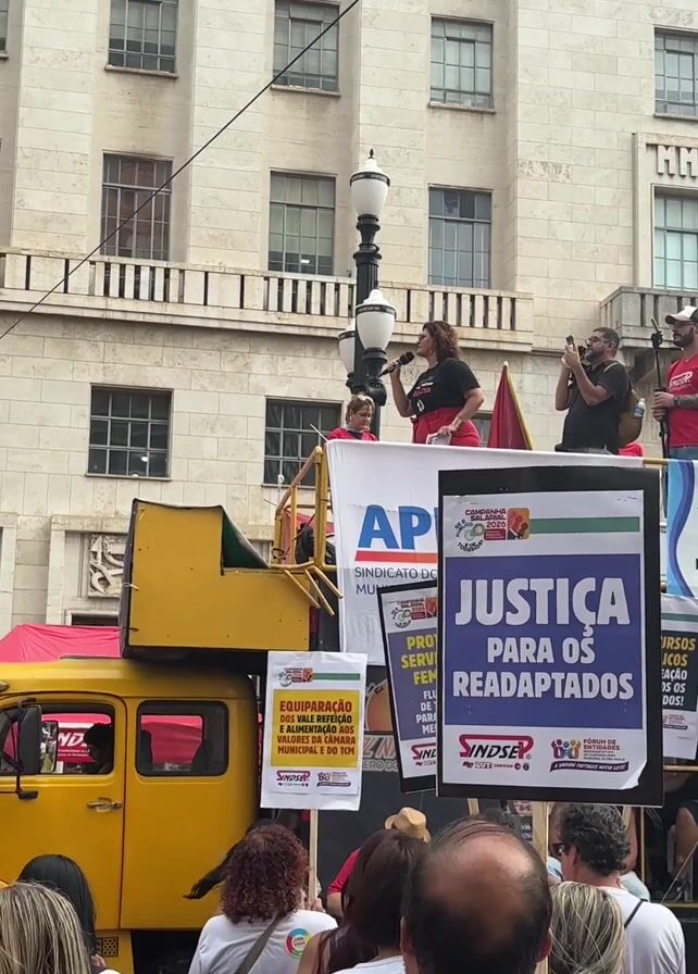 large group of people protesting on a city street. In the foreground, people hold signs with messages like "EQUIPARAÇÃO DOS VALES REFEIÇÃO DOS APOSENTADOS MUNICIPAIS E DO TCM" and "JUSTIÇA PARA OS READAPTADOS". Many wear white t-shirts with "SOMOS 100% SUS" printed on the back. A yellow truck with a raised platform serves as a makeshift stage, where several individuals stand, addressing the crowd. One person, wearing a red top, speaks into a microphone while others take pictures. A red flag bearing the word "SINDSFUMG" is visible. Buildings line the street, and overhead power lines are strung between them. The sky is overcast.