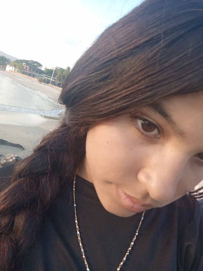The image depicts a close-up, angled portrait of a single individual against a coastal backdrop in Juan Griego, Venezuela. The subject, a female with a light brown complexion and dark brown eyes, is positioned in the lower right portion of the frame, looking towards the camera. She has long, dark brown hair, styled with a prominent braid extending over her left shoulder, and strands falling across her forehead. A subtle mole is visible below her right eye. She wears a dark-colored, likely black, short-sleeved top and a thin, gold-colored chain necklace adorned with small, light-colored beads. The background reveals a sandy beach with a gentle surf extending from the left to the center of the image. Scattered dark rocks are visible on the beach in the mid-ground. Beyond the immediate coastline, a row of multi-story buildings, varying in architectural style and possibly containing residences or businesses, lines the shore. Some buildings feature lighter-colored roofs. Interspersed among the structures are palm trees and other vegetation. In the distant background, a range of hills or mountains is visible under a light, partially cloudy sky, suggesting either early morning or late afternoon conditions.
