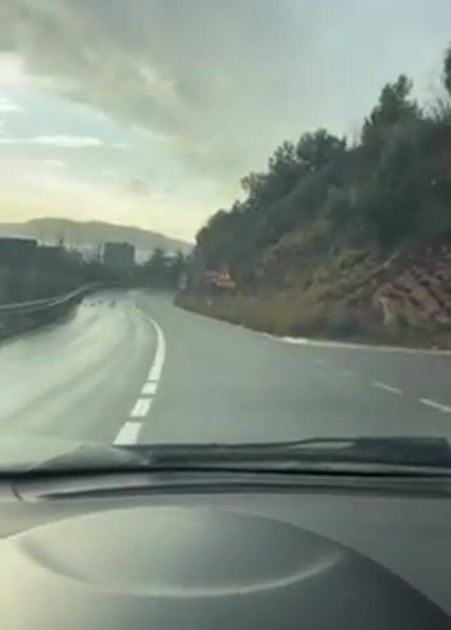 The view from inside a car shows a wet road curving to the left. A solid white line marks the right side of the driving lane. A guardrail runs along the left side of the road. A rocky hillside covered with trees is visible on the right, next to the road. A traffic sign indicating a curve ahead with a speed limit of 40 is visible on the right side of the road. In the distance, buildings can be seen under a cloudy sky. The car is moving forward. The dashboard is visible in the foreground.
