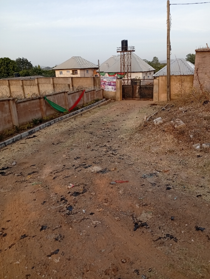 This image captures a static scene on an unpaved dirt path in Jos, Nigeria, looking towards a gated property