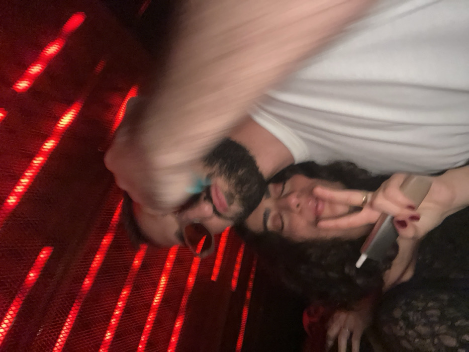 A blurry photo shows two people. One person, a male with dark hair and a beard, wears sunglasses. A second person, a female, has curly hair and holds up a peace sign. The female holds a rectangular object in her hand, possibly a phone or vape. Both are seemingly illuminated by red lights. One person is wearing a white shirt.