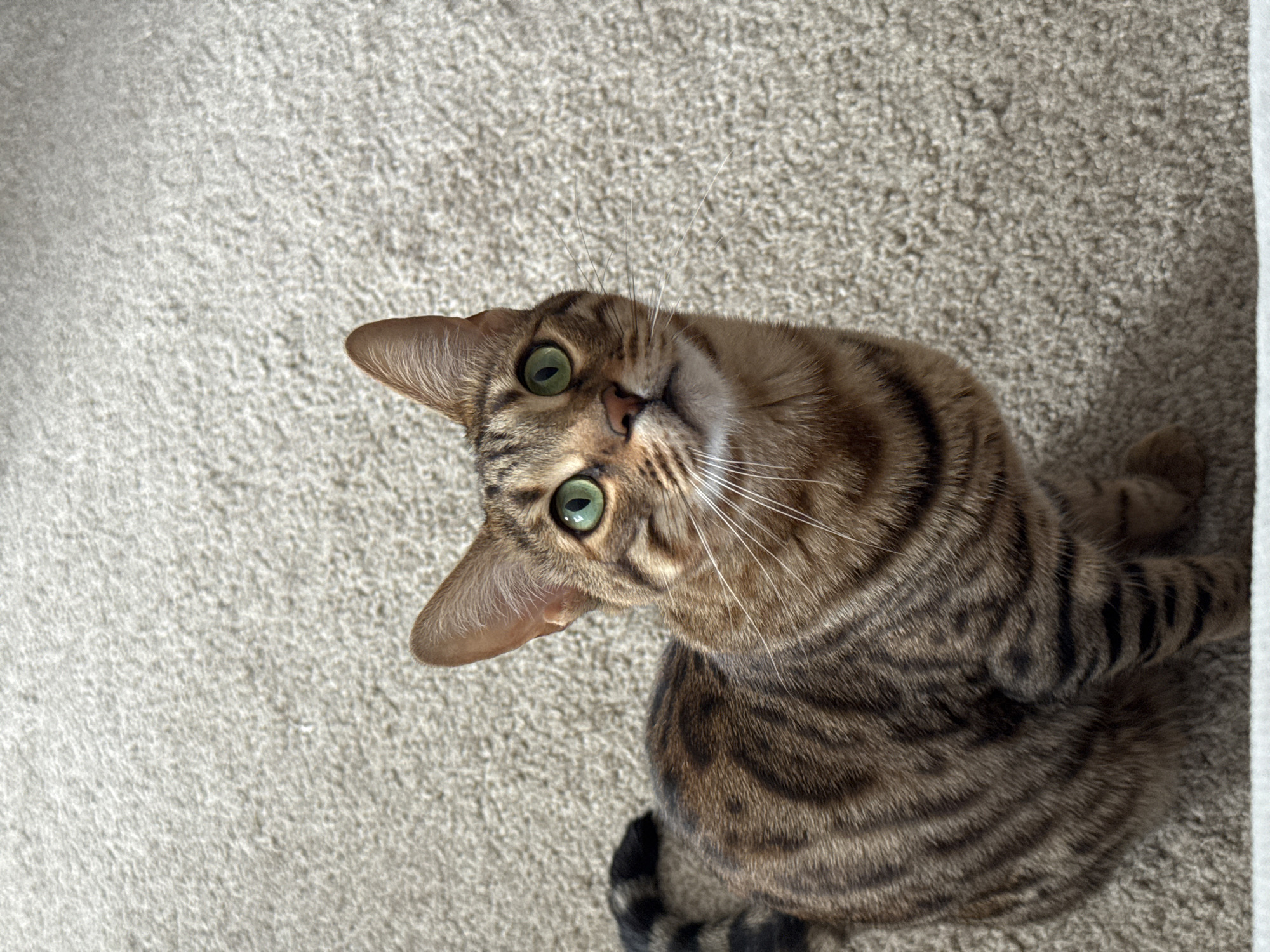 A Bengal-type cat is depicted sitting on a light beige, short-pile carpet in an indoor setting within the city of Votkinsk, Russia. The animal faces forward and slightly upward, with its head tilted slightly to the left, directing its gaze high to the left of the frame. Its eyes are a prominent bright green. The cat exhibits characteristic brown, tan, and black striped and rosetted markings across its fur, with a visibly striped tail partially seen on the left. White whiskers extend from its muzzle, which features a pink nose. The immediate environment consists solely of the textured carpet, which occupies the entire visible area around and beneath the cat. The lighting appears uniform and soft.