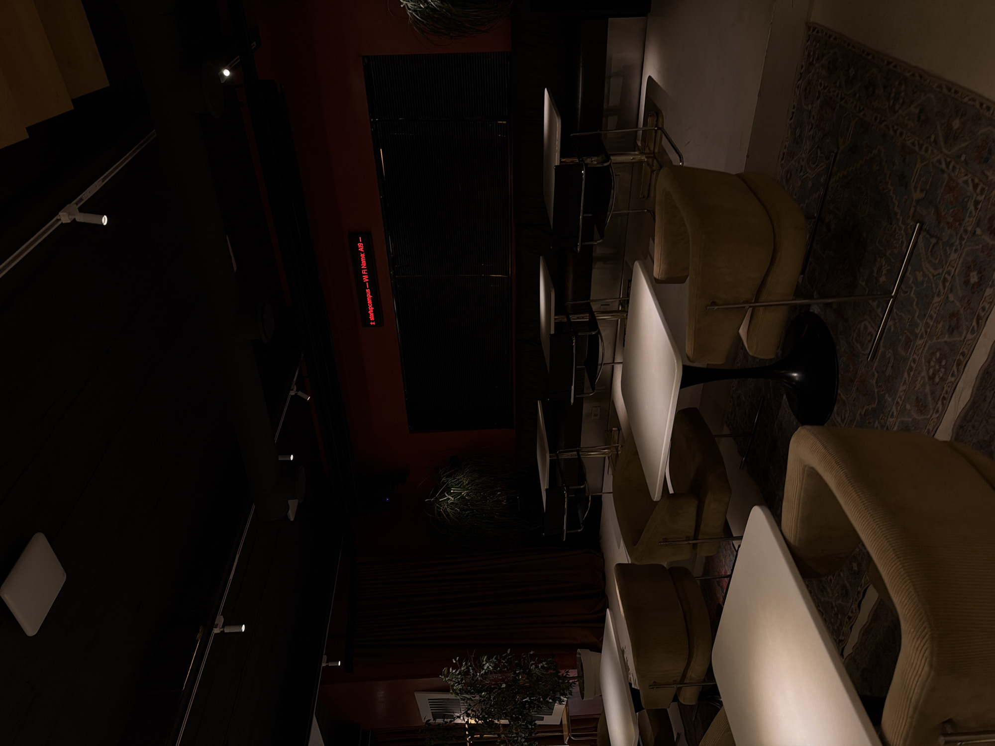 The image depicts an interior setting, seemingly a restaurant or cafe, located in Yerevan, Armenia. The arrangement features a series of tables and chairs oriented in a row, with a decorative rug adorning the floor to the right of the scene. The tables are topped with a white surface and paired with beige-colored armchairs that have a distinct curved back design. The backdrop consists of a wall painted in a dark, muted shade, likely maroon or burgundy. An LED sign is fixed to this wall, displaying the words "z. siddhacampus – Wi Fi Name: A19 –". The lighting within the space is subdued, enhancing the ambiance of the setting. Various plants are present, contributing to the decorative environment. The image is taken from an elevated perspective, offering a comprehensive view of the interior.