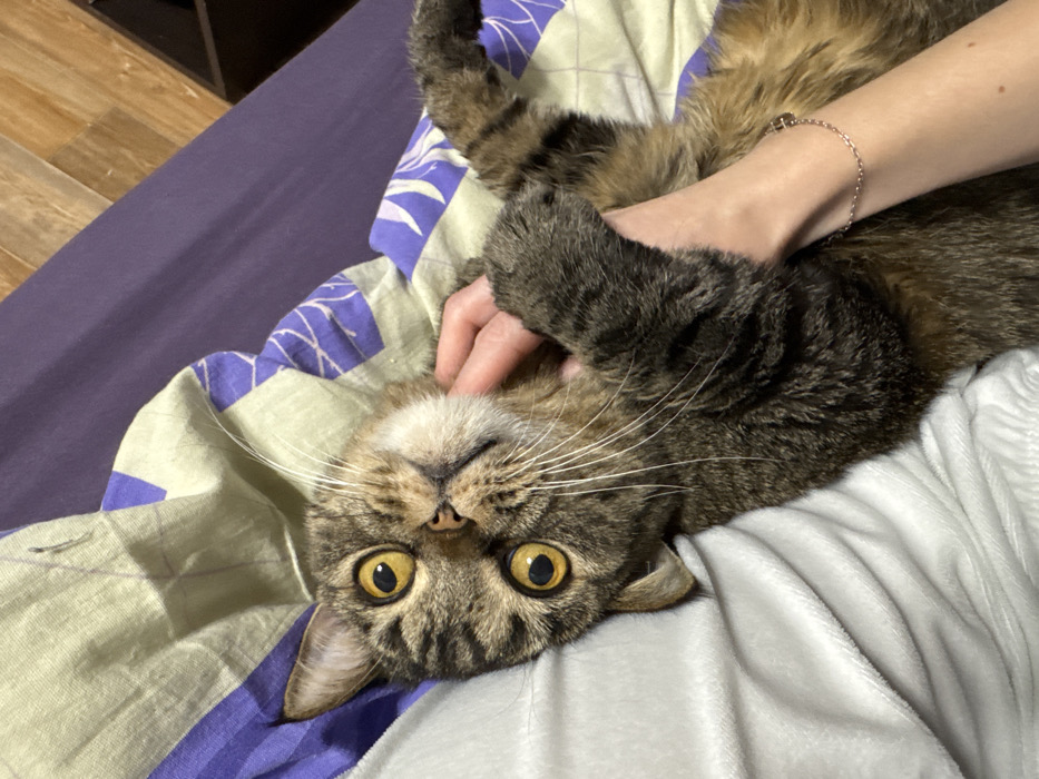 The scene is set indoors, within the city of Perm, Russia, likely a bedroom. A domestic tabby cat, displaying a brown, black, and tan striped coat, is positioned on its back, with its head tilted upwards, facing the camera. The cat features prominent, wide yellow eyes with dilated pupils, a pink nose, and visible white whiskers. A human hand, with fair skin and adorned with a thin, light-colored chain-link bracelet on the wrist, is gently cradling the cat's torso. The fingers of the hand are interacting with the cat's fur around its neck and chest area. The cat's front paws are partially visible, one resting lightly on the human hand. The immediate surface beneath the cat and human hand is a light grey, soft-textured blanket or duvet. In the background, a bed is covered with a patterned duvet cover, featuring light green and purple geometric or abstract designs. A dark wooden surface, consistent with a headboard or wall panel, is visible in the upper right portion of the frame.