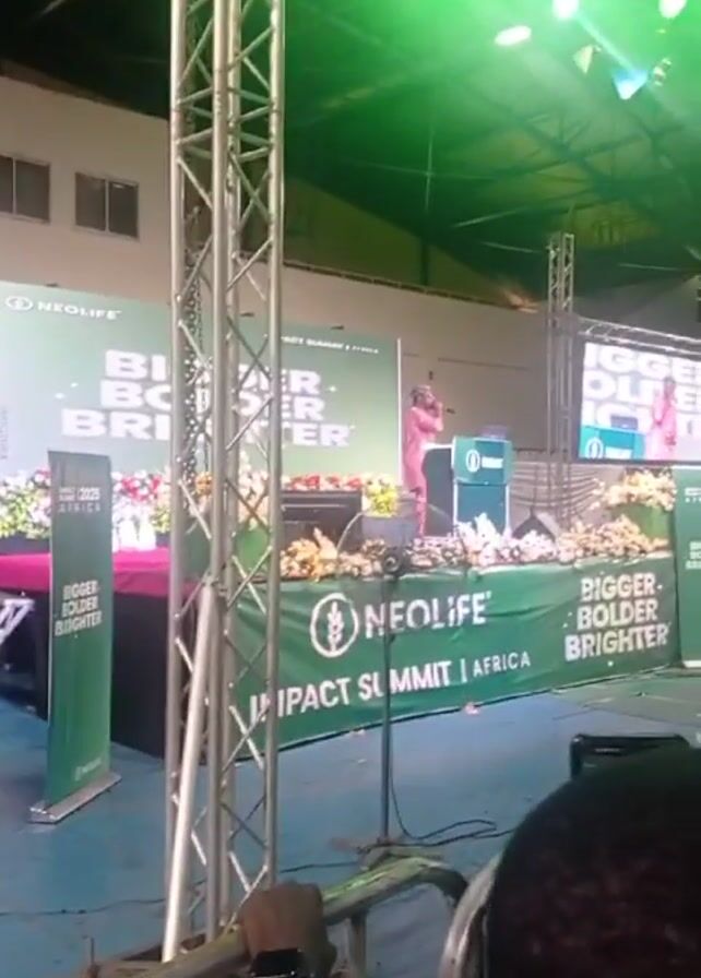 n indoor event, presumably a NeoLife Impact Summit Africa, with a speaker on stage wearing a pink outfit