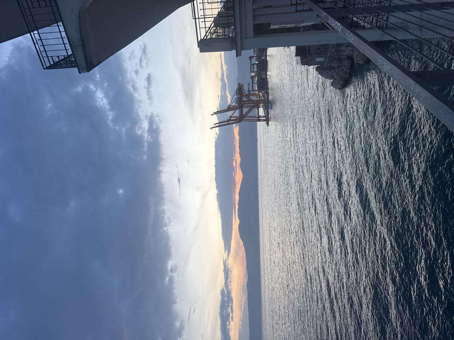 The image displays a coastal scene at sunset in Grad Rijeka, Croatia. The foreground features dark grey metal balcony railings, partially obscuring the lower right. To the right, a multi-story, light-colored concrete building with multiple balconies and dark railings extends downwards towards a rocky coastline. The expansive body of water, likely the Adriatic Sea, occupies the central and left portions of the frame, exhibiting small ripples on its surface and reflecting the low light conditions. On the distant horizon, a range of dark mountains is silhouetted against the sky. A prominent port facility is visible in the middle ground to the right, characterized by several large, orange-colored gantry cranes standing on a pier. A small white vessel is discernible in the water near the pier structures. The sky transitions from dark blue-grey clouds overhead to a lighter blue, culminating in a warm band of orange and pink light along the horizon, indicative of sunset. No people are visible.