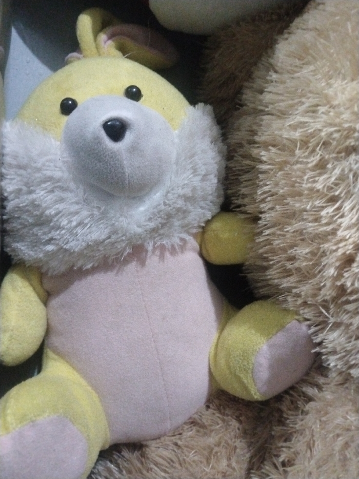 A plush toy, resembling a rabbit, is centrally positioned in the foreground
