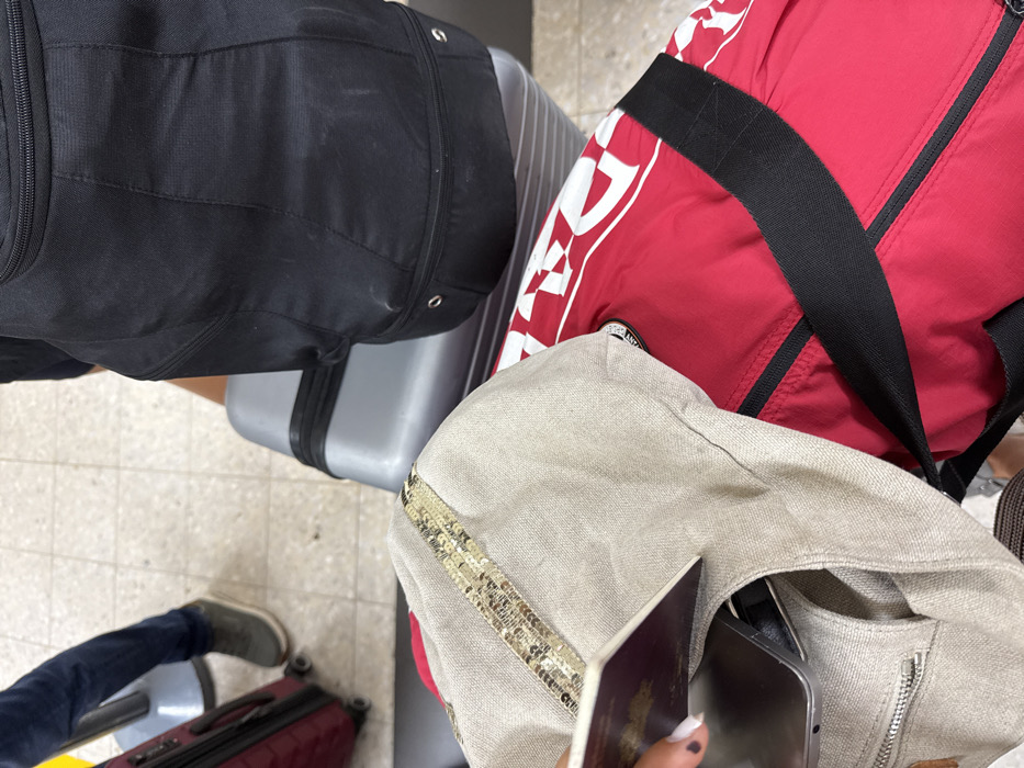 The image depicts an indoor travel environment, likely an airport or ferry terminal in or near Malé, Maldives, such as Velana International Airport. In the foreground, a person's left hand, with short, dark-painted nails, holds open a dark-colored passport and a dark smartphone. These items are partially inserted into a light beige, linen-textured shoulder bag featuring a gold sequined strap and a silver zipper pull. Beneath this, a red duffel bag with a black strap and a white patterned design is visible. In the mid-ground, a silver hard-shell roller suitcase supports a black backpack with silver grommets at its base. The background reveals the lower legs of an individual wearing blue jeans and grey sneakers, standing beside a burgundy hard-shell roller suitcase and a yellow and grey barrier post. The floor consists of light-colored square tiles. The scene indicates a waiting or queuing area associated with travel.