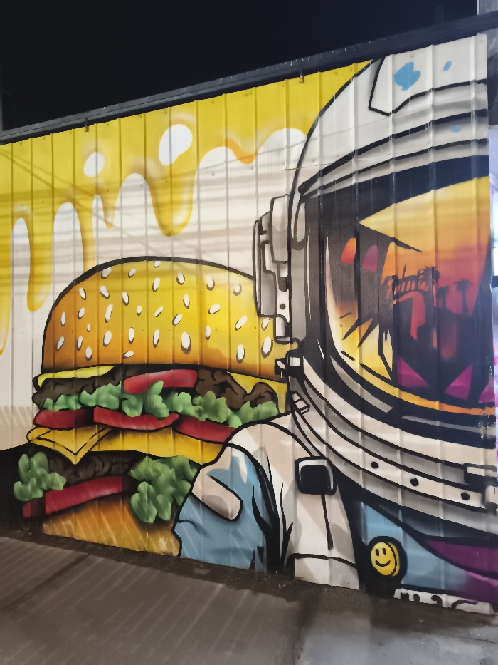 A mural on a yellow and gray corrugated metal wall features a large, stylized hamburger and an astronaut