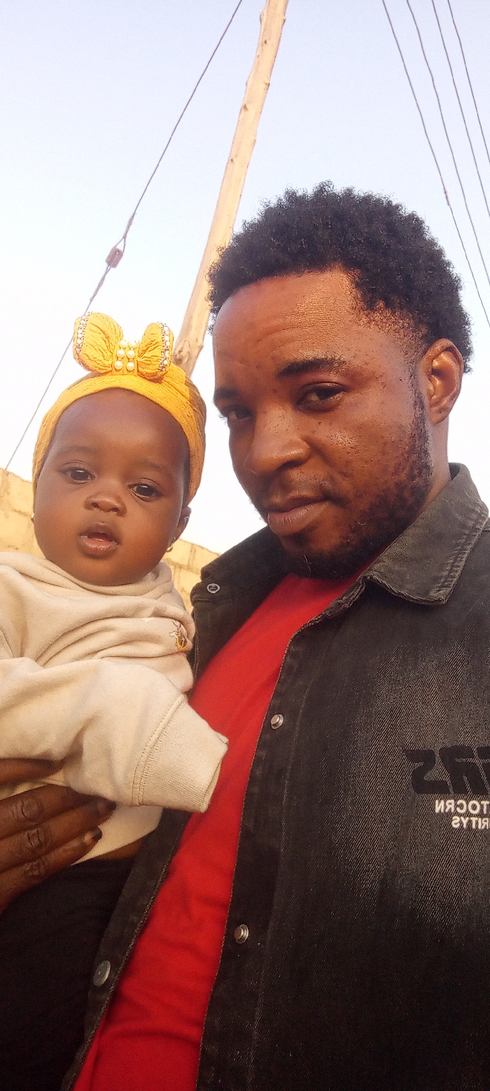 A man poses with a baby wearing a yellow headband with a bow and faux pearls. The man has dark curly hair and a beard. He is wearing a red shirt under a dark denim jacket with snaps. Power lines run diagonally across the upper right corner. The background is a pale blue sky and a neutral-colored wall. The baby is wearing a light-colored sweatshirt.