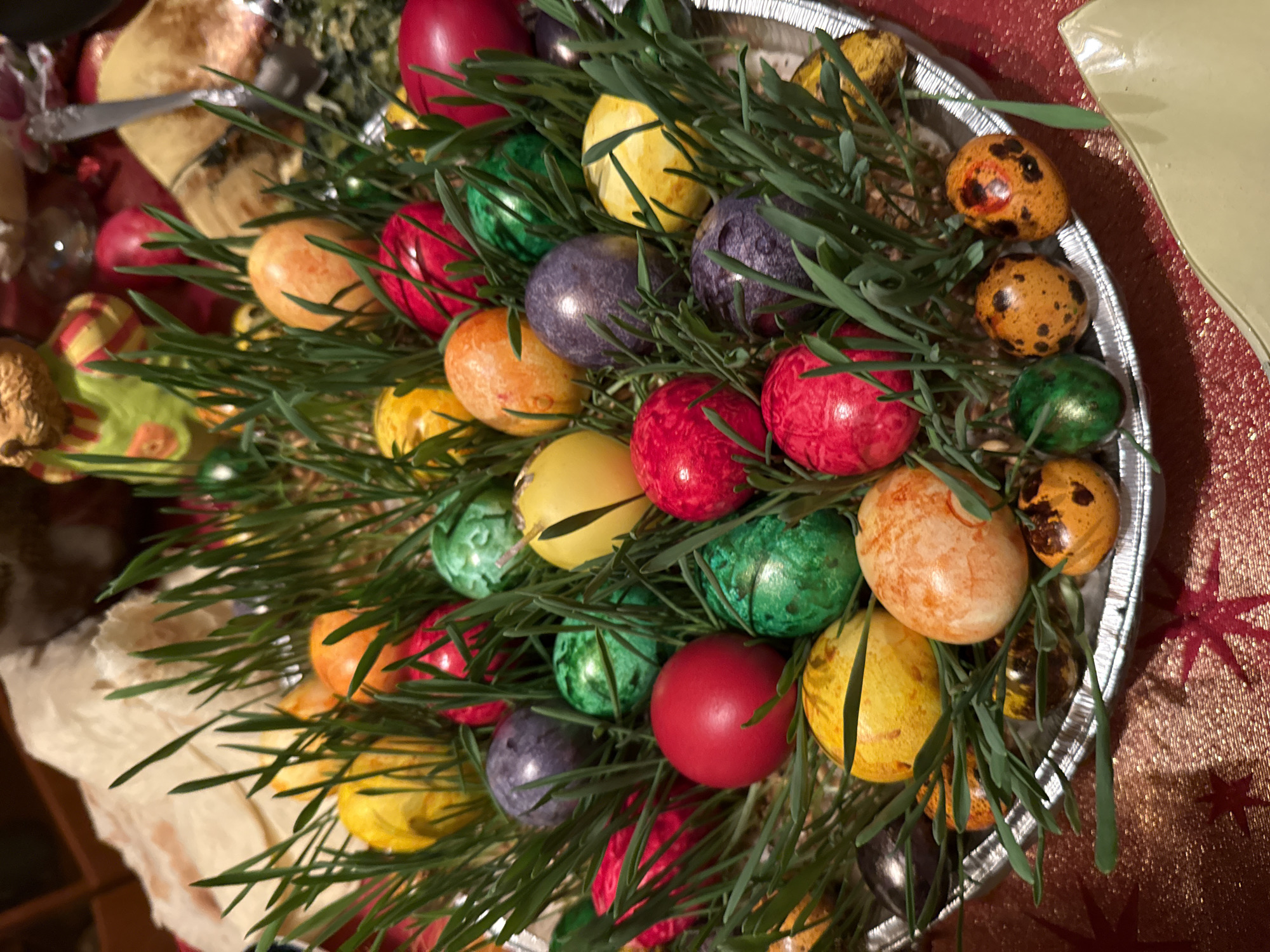 silver platter filled with dyed Easter eggs in various colors (red, orange, yellow, green, and purple) interspersed with sprigs of green foliage. The platter also contains a number of quail eggs. The platter is sitting on a red, sparkly tablecloth. Part of a figurine is visible on the left. The location is unknown and it is not possible to ascertain from the image that this is Burgas, Bulgaria.