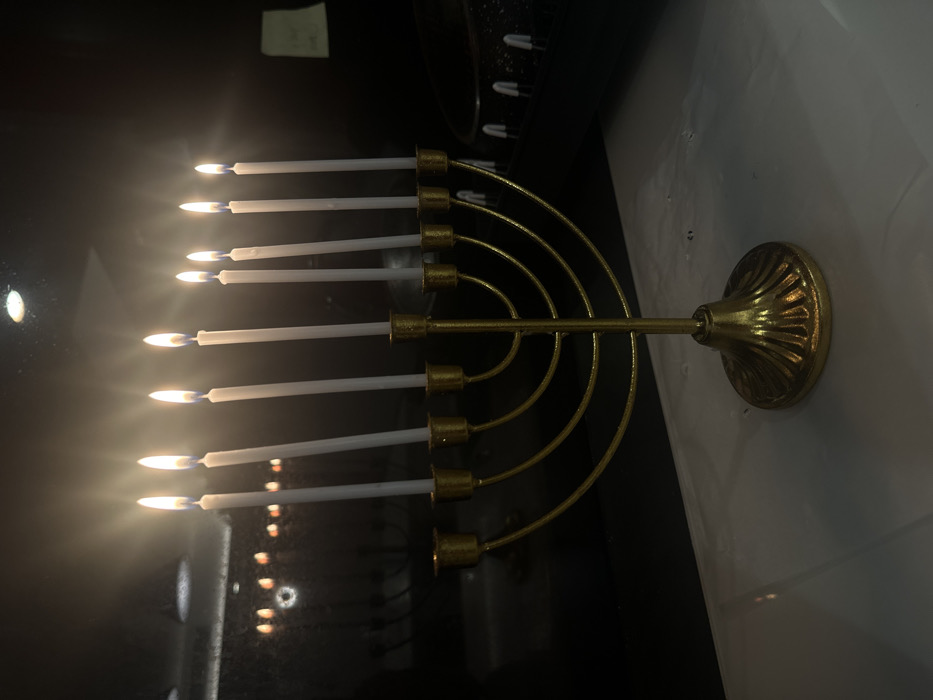 A forensic examination of the image reveals a gold-colored, nine-branched menorah positioned centrally on a light-colored, reflective surface