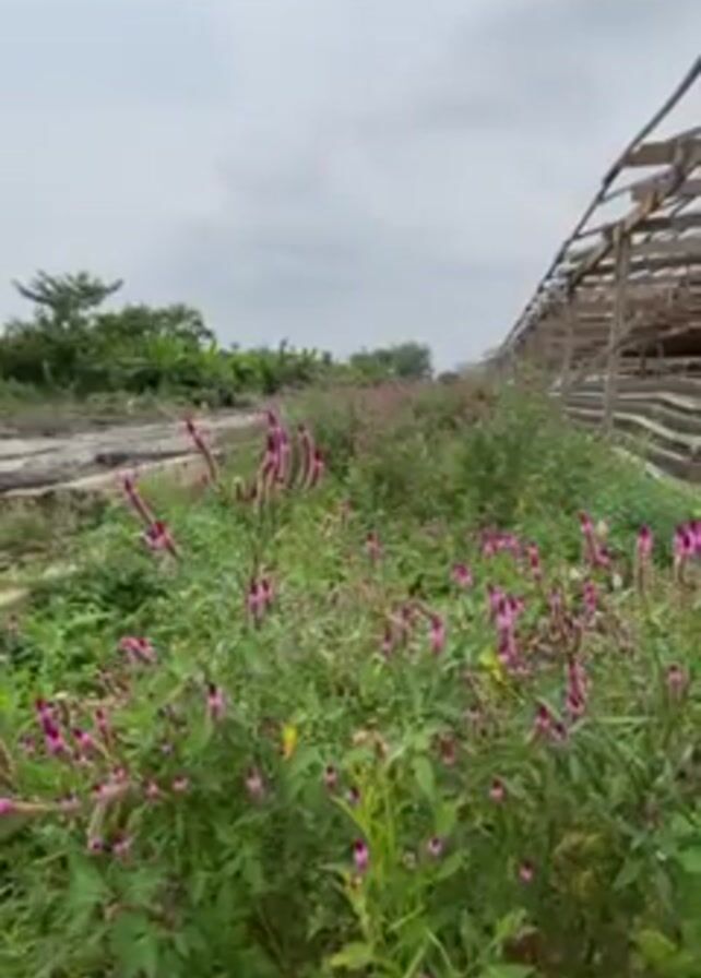 field of green plants with pink flowers growing in front of a dilapidated wooden structure. The sky is overcast. Other vegetation is visible in the background. A concrete structure is also visible.