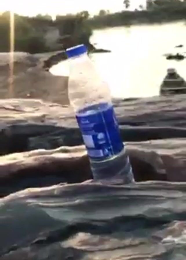 plastic water bottle with a blue cap, partially filled with water. It rests on a dark, rocky surface near a body of water, possibly a river or lake, under a golden sunset sky. The foreground is slightly out of focus, while the background shows a shoreline with green trees and the sun reflecting off the water. The camera angle suggests a low perspective, focusing on the bottle and the surrounding natural environment.