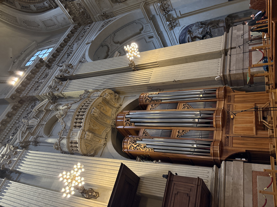 The image displays the interior of the Metropolitan Cathedral of San Pietro in Bologna, Italy. The scene is an upward-angled view of the left nave, dominated by a large pipe organ. The organ is constructed with a dark-stained wooden case featuring intricate carved panels and fretwork, framing numerous silver-toned metal pipes of varying lengths. Above the organ, a highly ornate, gilded balcony with a balustrade is integrated into the wall structure, positioned between massive, fluted Corinthian columns that rise toward an intricately decorated, high vaulted ceiling. The architectural elements throughout the visible space, including the columns, arches, and ceilings, are adorned with extensive Baroque ornamentation such as friezes, cornices, and sculpted details in light stone tones. Artificial lighting is provided by several multi-bulb sconces or chandeliers mounted on the columns, casting a warm glow. Natural light enters through a high, rectangular window visible in the upper right quadrant. At floor level in front of the organ, multiple black microphone stands are positioned. To the far left, a dark wooden structure, possibly part of a pulpit, is partially visible. In the foreground, simple wooden pews or benches are discernible, with sections delineated by red velvet ropes and brass stanchions. On the far right side of the image, three individuals are partially visible near additional pews, with two men in dark attire appearing to be seated or standing. No specific actions or interactions are clearly discernible among the individuals.
