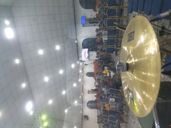 large room with a tiled ceiling and many bright lights. There are numerous rows of blue chairs facing a stage. The stage is obscured by a large sheet of clear plastic. A large, gold cymbal is in the foreground. The image appears to be taken from the front of the room, looking towards the stage. The room is likely a church auditorium in Port Harcourt, Nigeria, as the coordinates provided correspond to a location in that city. The image is most likely from a church service, as there are people sitting in the chairs and a large screen on the stage. The people are mostly obscured by the plastic sheet, but some are visible sitting in the chairs.