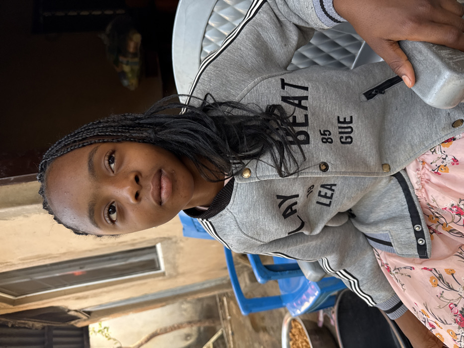 A young woman with dark skin and braided hair looks at the camera. She is wearing a gray varsity-style jacket with black and white striped sleeves. Underneath the jacket, a floral pink dress can be seen. The background features a mix of indoor and outdoor elements, including a blue plastic chair, a window, and parts of a building.