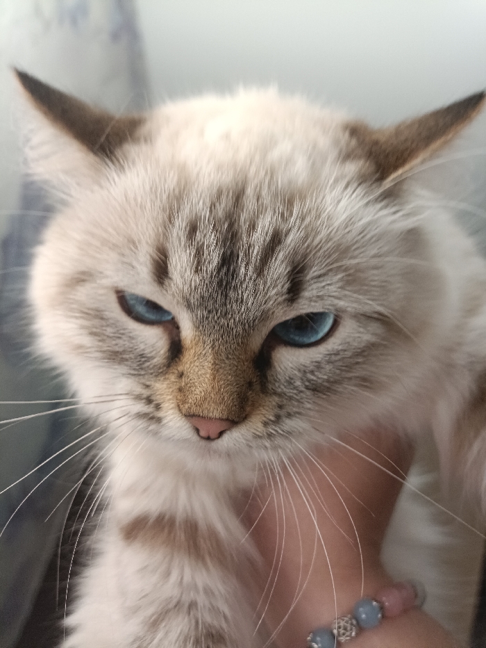 A close-up captures a lynx point Siamese cat with piercing blue eyes. Its fur is predominantly white with light brown or grey markings around the ears, nose, and forehead. Long white whiskers extend from its face. A pink nose sits above light brown fur. The cat appears to be held, with a hand and a beaded bracelet visible. The cat stares intently into the camera.