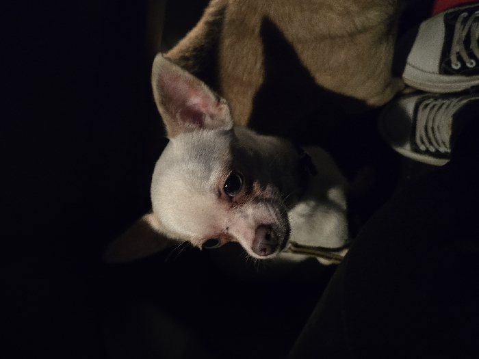 - "The scene depicts a small, light-colored canine, identified as a Chihuahua or similar toy breed, positioned within a dimly lit environment in Willems, France" by FM-dTRWD3, licensed under CC BY 4.0