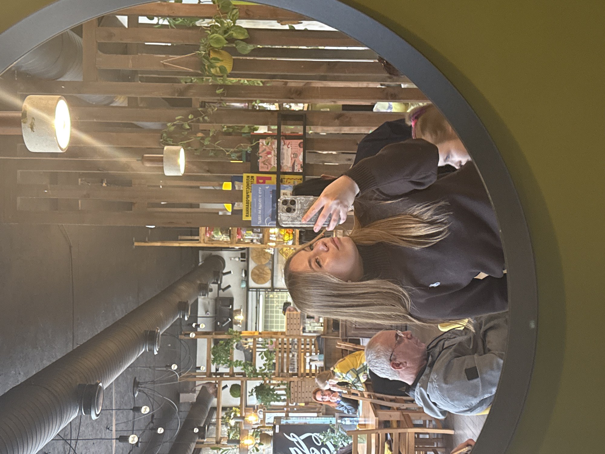 The image depicts the interior of a contemporary cafe or restaurant, located in Sochi, Russia, viewed primarily through a large oval or round mirror. The central subject is a young woman, with long light-brown hair and wearing a dark brown turtleneck sweater, who is capturing a selfie using a smartphone held in her right hand. She is positioned to the right within the mirror's reflection, with her head slightly tilted and lips pursed. Reflected in the mirror, the establishment features a dark ceiling with exposed grey ventilation ducts and a variety of hanging light fixtures, including industrial-style bare bulbs and modern pendant lights with cylindrical concrete-like shades. The decor emphasizes natural elements, with extensive wooden lattice shelving adorned with numerous potted plants, including hanging varieties in yellow pots. Wooden tables and chairs are arranged throughout the space. Several other patrons are visible in the reflection. To the left of the main subject, an older man with short grey hair and glasses is seated, wearing a grey hooded jacket and looking downwards. Further in the background, to the left of the image's center, two women are seated at a wooden table; one has red hair and glasses, while the other wears a yellow plaid shirt. A child's head, possibly a girl with a pink headband, is partially visible in the lower right corner of the mirror's reflection. Shelves in the background display various items, including books with Cyrillic text, such as "РАННАЯ БРОШЮРА" (Rannaya Broshyura - Early Brochure) and "Я ВЫБИРАЮ ВАС" (Ya Vybiraю Vas - I Choose You). The mirror itself has a dark grey frame, set against a yellowish-green wall.