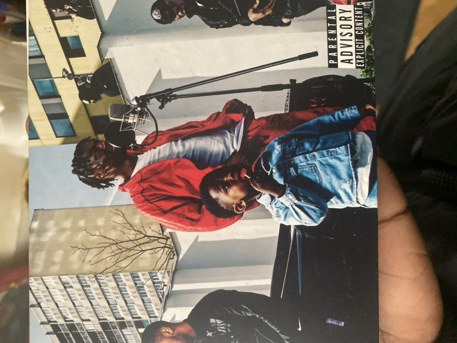 The image displays an outdoor urban scene set in Pantin, France. In the center, a dark-skinned male with dreadlocks, wearing a red tracksuit over a white t-shirt, stands facing slightly right, positioned behind a silver condenser microphone on a black stand. Directly in front of him is a young dark-skinned boy, wearing a blue denim jacket over a white t-shirt, holding a red lollipop in his mouth. To the left, a partial view of a dark-skinned male shows him wearing a black long-sleeved shirt with a white logo on the arm. A dark-colored vehicle is partially visible behind the boy and this individual. To the right, another dark-skinned male is partially visible, wearing a black jacket and a black baseball cap. The lower right corner features a black rectangle with white text stating "PARENTAL ADVISORY EXPLICIT CONTENT." The background includes a tall, light-colored residential building with numerous windows on the left, separated from the foreground by a white wall. A bare tree is situated in front of this building. On the right background, a yellow multi-story building with blue windows is visible. Several silhouetted figures are discernible on the upper levels or rooftops of the background structures, with one figure on the yellow building appearing to operate a camera on a tripod. The scene is illuminated by daylight.