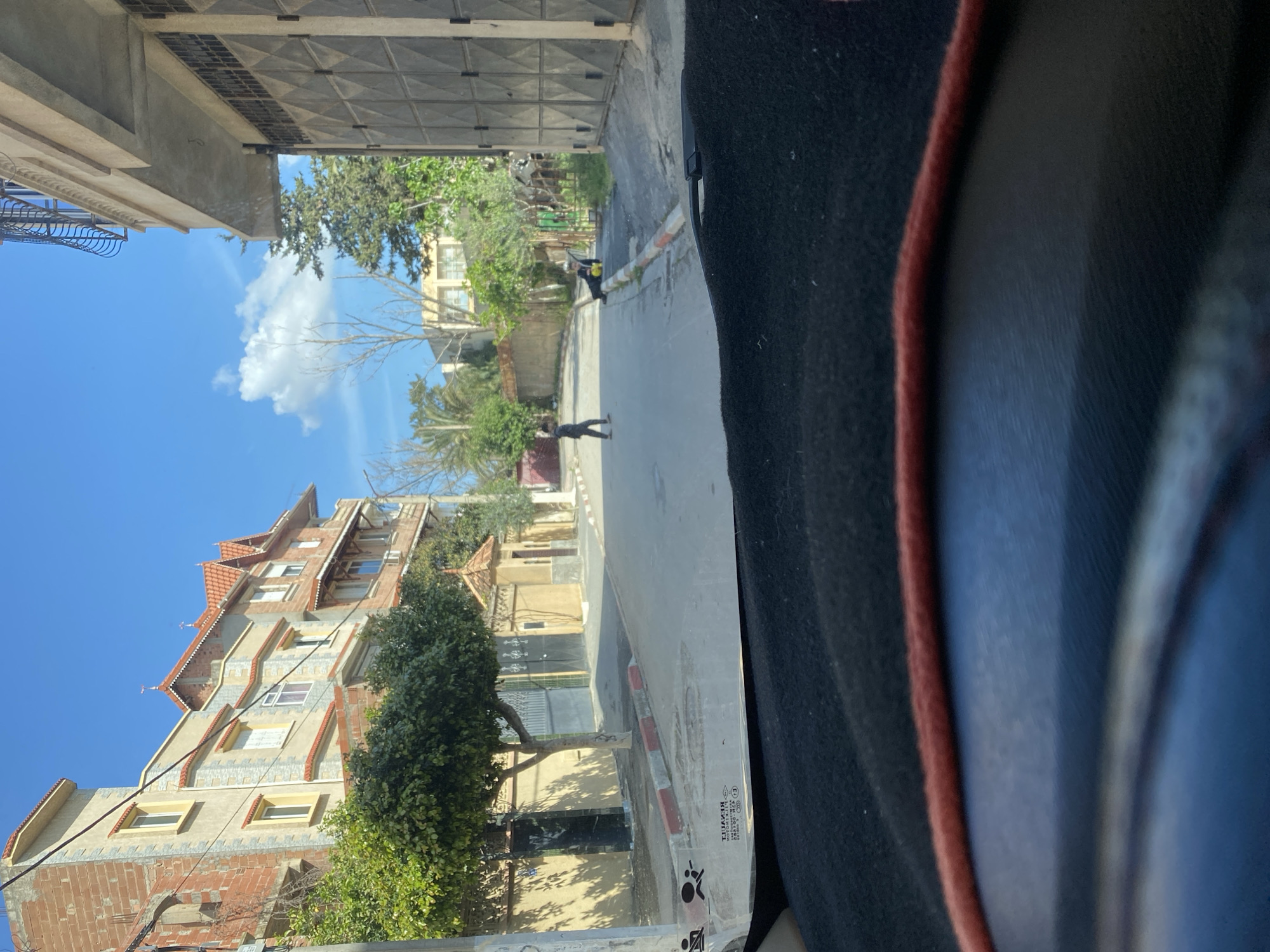 The image displays a daytime street scene in a residential area of Baraki, Algeria, observed from inside a vehicle. The immediate foreground reveals a dark, textured dashboard and a windshield reflecting an upside-down "RENAULT" logo. A paved road, bordered by concrete curbs painted with red and white stripes, extends through the middle ground. A young male, dressed in dark clothing, walks across the road from left to right. Further down the street on the right, an individual is seated or reclined on the ground next to a yellow object near the curb. On the left side of the street, a multi-story building features a combination of red brick and light-colored stone facades, characterized by multiple windows with yellow frames and decorative red-tiled roof sections. A green, leafy tree stands in front of a wall with two dark metal gates on the left. A concrete utility pole is positioned near the left frame edge. On the right side, a building with large, dark metal gates and an ornamental black metal balcony railing is visible. The background includes additional residential structures and various trees, all under a clear blue sky with scattered white cumulus clouds.